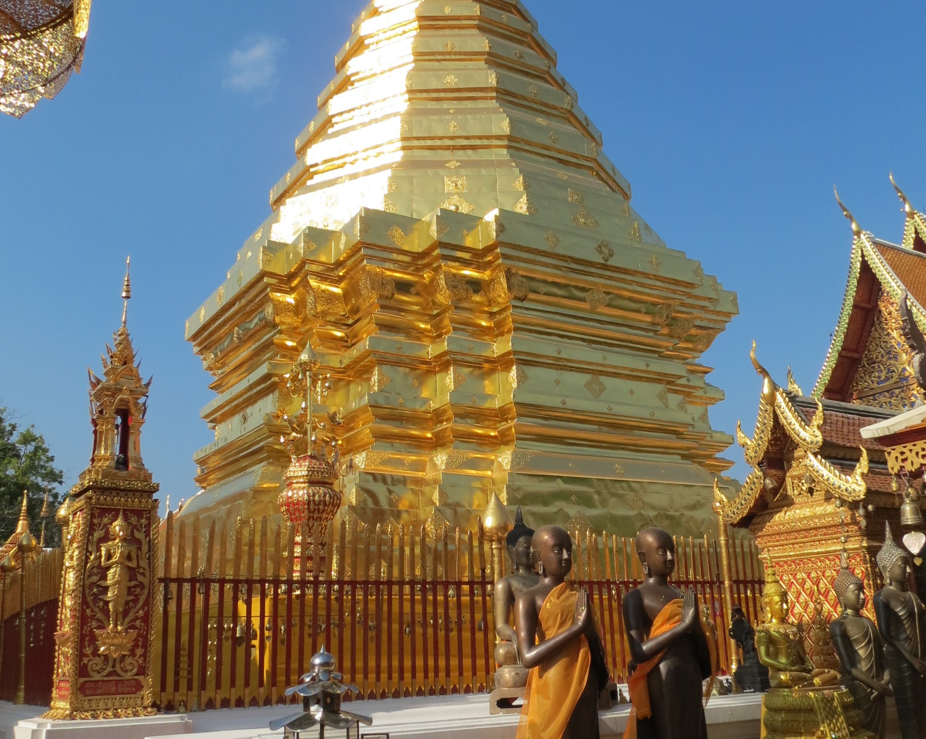 This wat is covered in gold at the top of a hill to the west of Chiang Mai, Thailand.